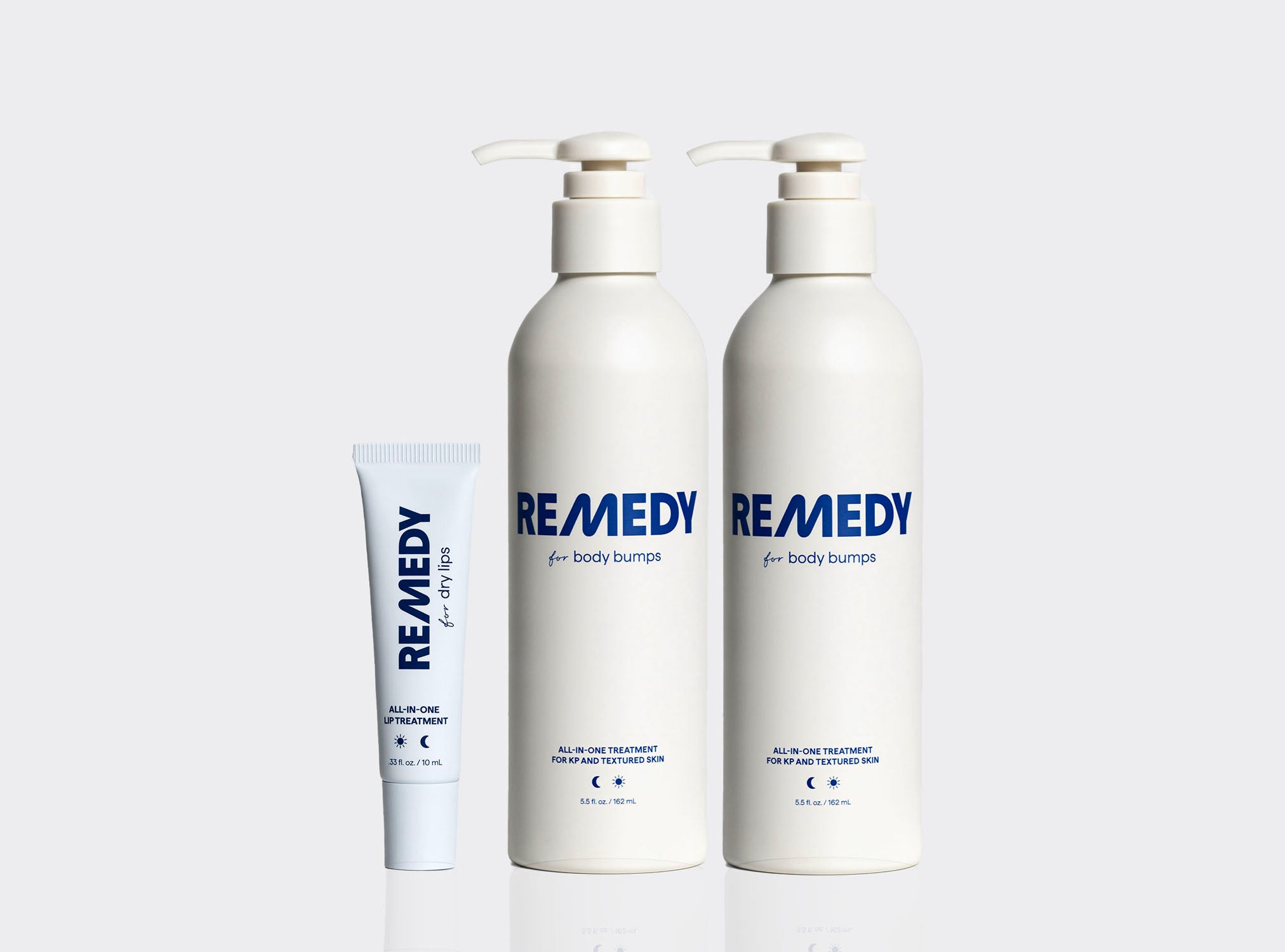 Double up on Remedy for Body Bumps to transform skin texture and tackle keratosis pilaris faster, plus our Remedy for Dry Lips provides triple-action lip repair and hydration. Each formula stacks multiple clinically proven ingredients into one targeted treatment for maximum results. Body: 5.5 fl. oz. each | Lips: .33 fl. oz.