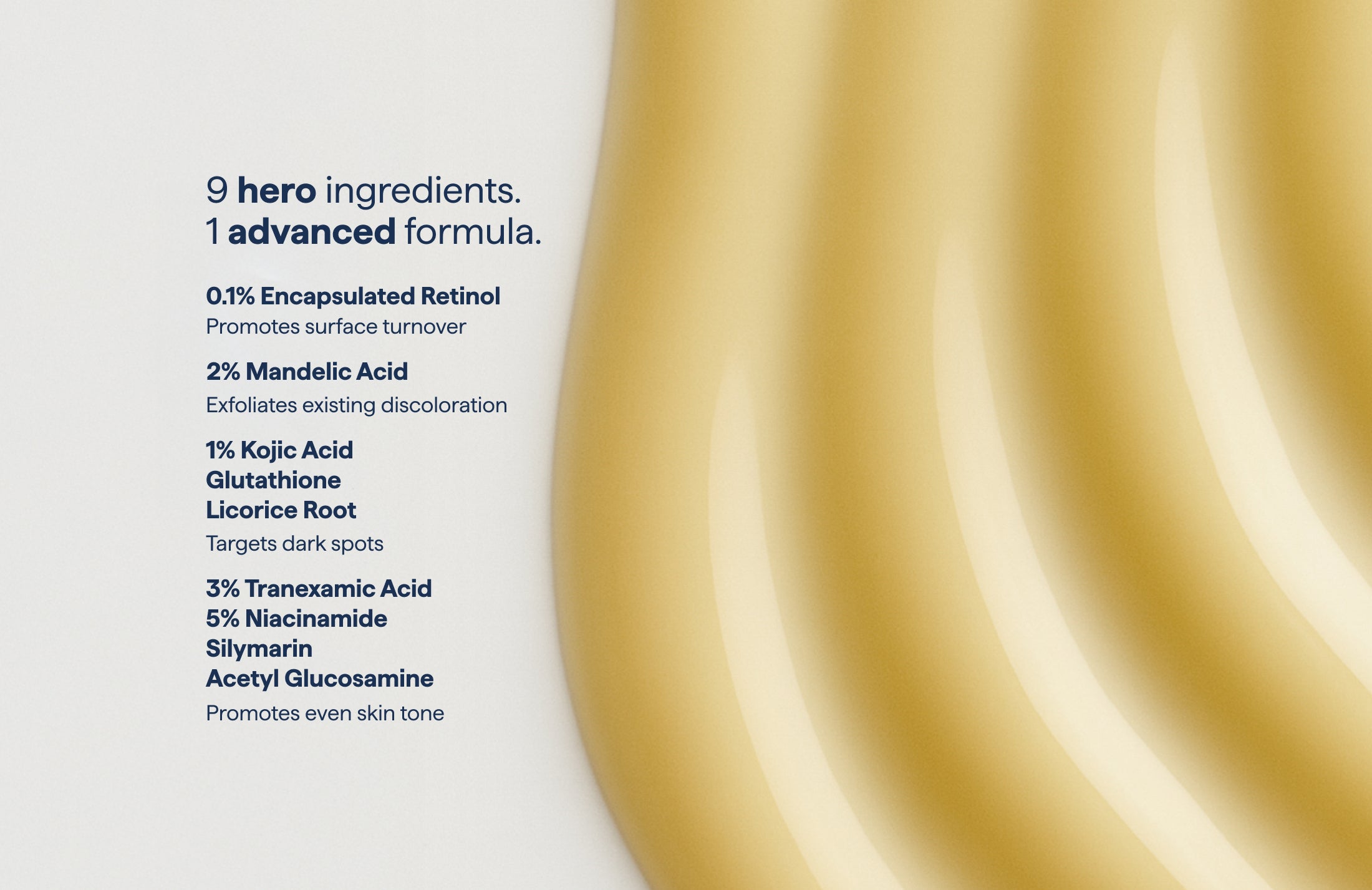 Our dermatologist-formulated treatment addresses the root cause of dark spots and helps prevent and treat them at every stage. Retinol and mandelic acid help clear up existing spots, while the rest of our super-stacked formula helps prevent new ones from forming.
