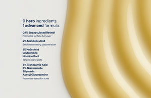 Water (Aqua), Glycerin, Niacinamide, Squalane, Cetearyl Olivate, Dimethicone, Mandelic Acid, Tranexamic Acid, Sorbitan Olivate, Glutathione, Tetrahexyldecyl Ascorbate, Glycine Soja (Soybean) Seed Extract, Kojic Dipalmitate, Silybum Marianum Fruit Extract, Retinol, Camellia Sinensis (Green Tea) Leaf Extract, Curcuma Longa (Turmeric) Root Extract, Acetyl Glucosamine, Ceramide NP, Glycyrrhiza Glabra (Licorice) Root Extract, Propanediol, Hydroxyethyl Acrylate/Sodium Acryloyldimethyl Taurate Copolymer, Isohexadecane, Caesalpinia Spinosa Gum, Caprylic/Capric Triglyceride, Pentylene Glycol, Polysorbate 60, Polysorbate 20, Sorbitan Isostearate, Cetyl Palmitate, Laureth-23, Trideceth-6 Phosphate, Sodium Hydroxide, Caprylyl Glycol, Hexylene Glycol, Phenoxyethanol, Ethylhexylglycerin, Sodium Benzoate