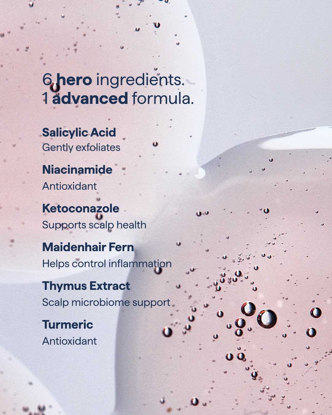 Our dermatologist-formulated scalp treatment uses 1.8% Salicylic Acid to treat dandruff and dissolve flakes. The rest of our super-stacked formula, with Ketoconazole and other soothing botanicals, helps maintain scalp comfort and promote a balanced, healthy scalp environment.