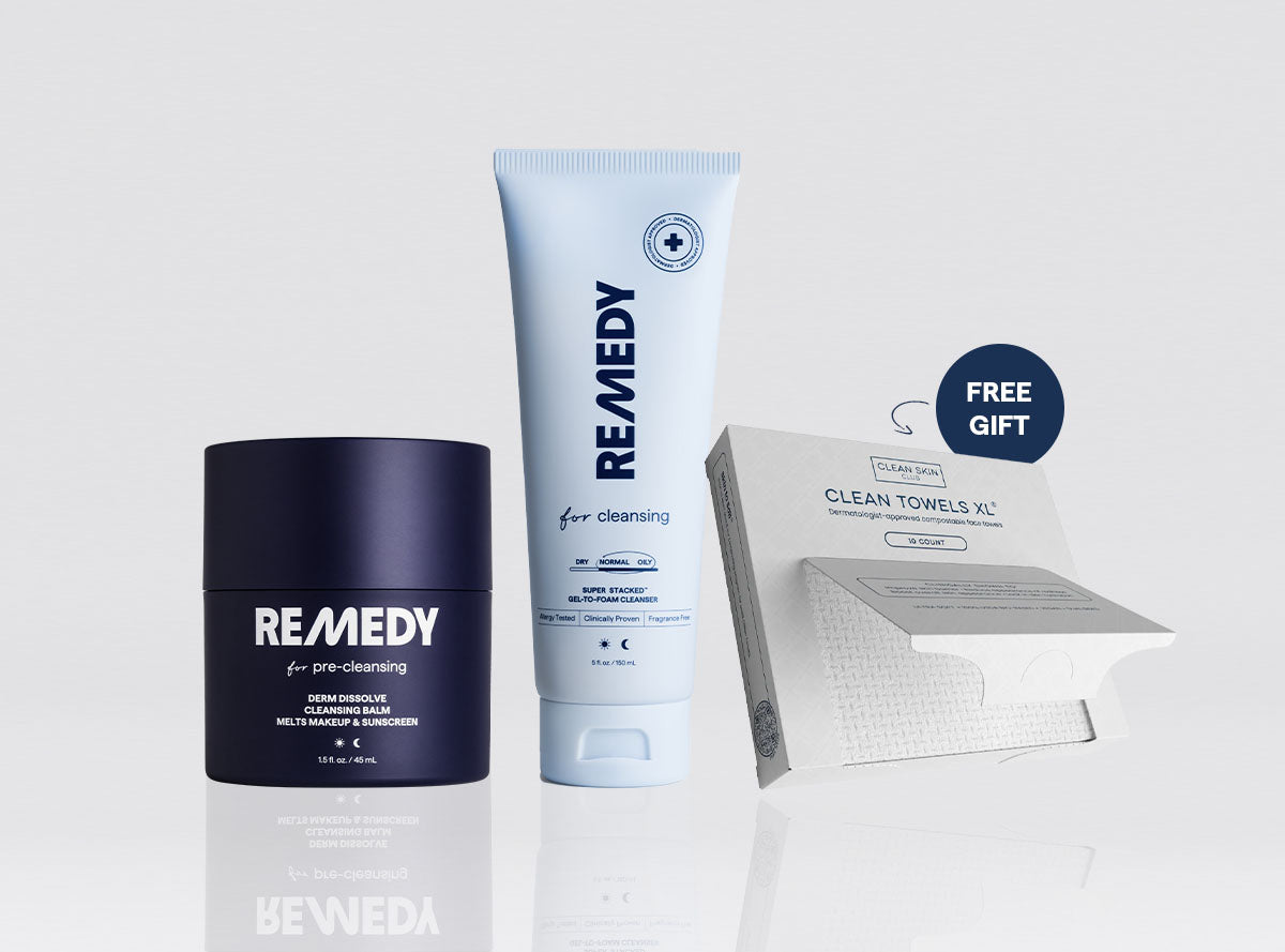 Derm Dissolve Cleansing Balm melts away makeup, sunscreen, and excess oil while supporting the barrier with safflower lipids and ceramides. Gel-to-Foam Cleanser follows to unclog pores and remove residual oil and impurities with gentle salicylic acid, helping reduce buildup that can lead to breakouts. A targeted double-cleanse routine designed to remove excess sebum, deeply purify, and maintain balance without stripping.