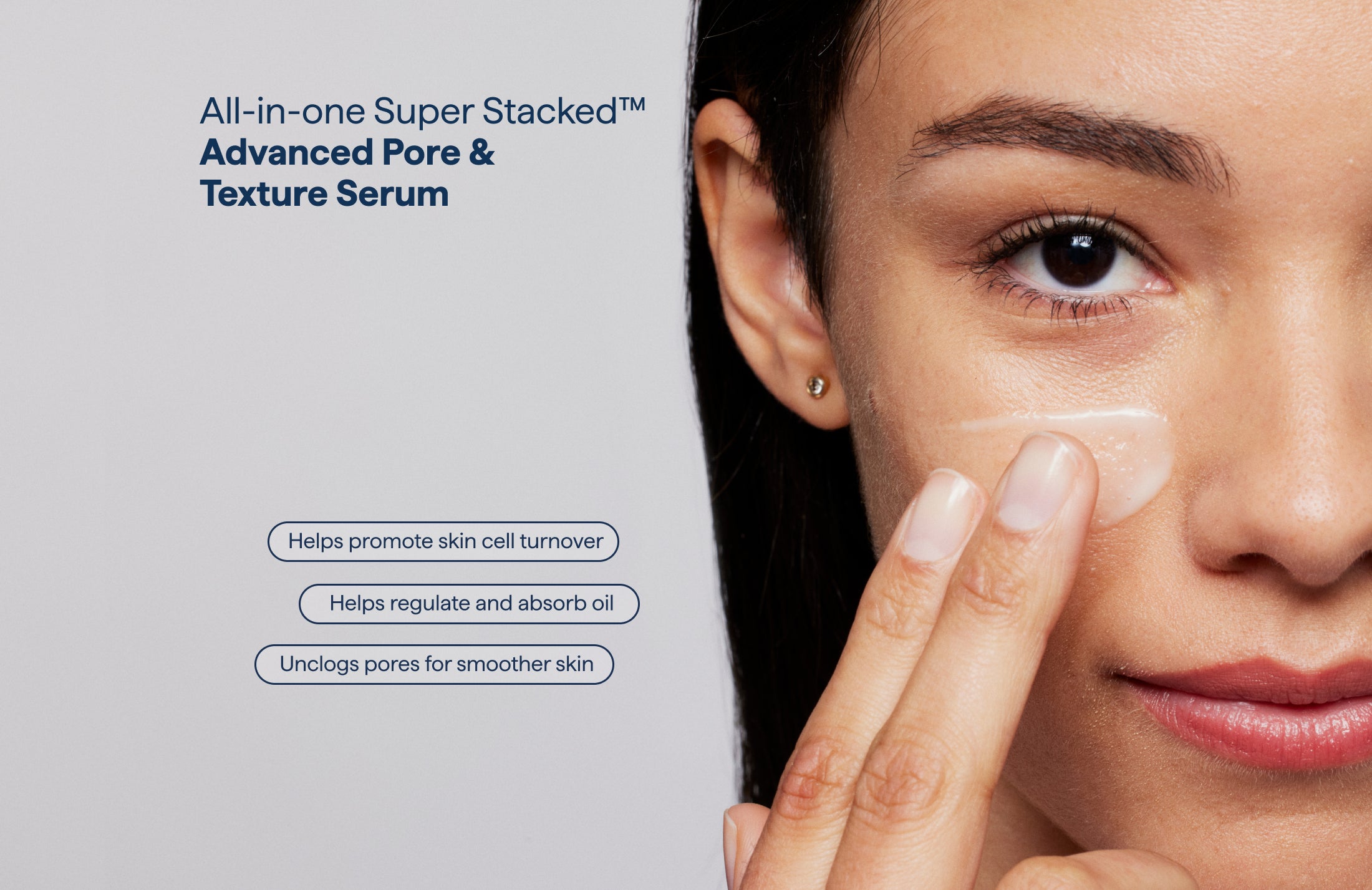 This Super Stacked treatment packs the power of six products into one formula. Retinol helps support skin turnover, while salicylic acid helps clear pores to reveal healthy, beautiful skin. Niacinamide and kinetin work together to improve texture and minimize pore appearance.